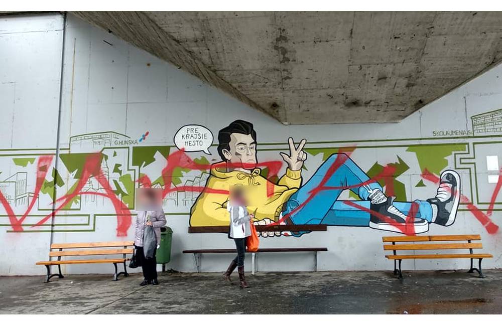 Street art maľbu na zastávke Bernolákova v Žiline neznámy vandal presprejoval