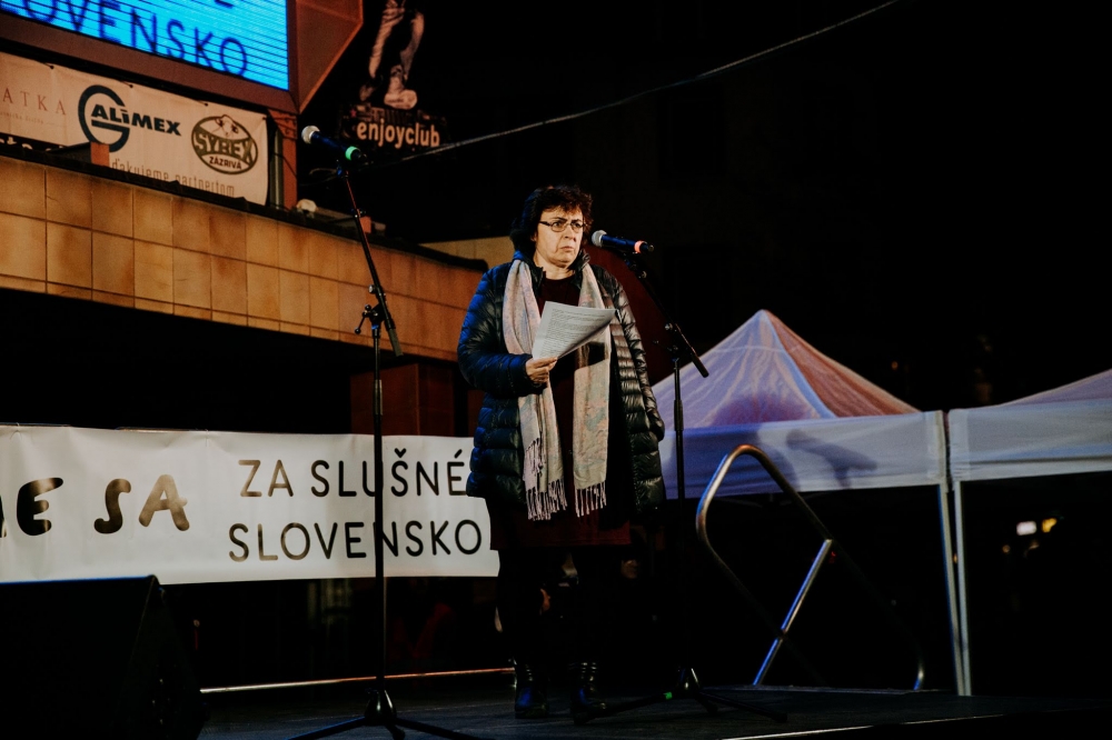 Ďakujeme organizátorom dnešného verejného zhromaždenia za možnosť tu dnes vystúpiť a vám všetkým za to, že ste prišli podporiť túžbu nás všetkých žiť na Slušnom Slovensku. Práve pre túto túžbu, zhmotnenú v kvalitnú investigatívnu novinársku prácu, museli pred rokom zomrieť dvaja mladí ľudia. Ich úkladná vražda zmenila našu krajinu. Donútila nás precitnúť zo zlého sna, v ktorom sme v anonymnej tichosti žili. Áno až smrť dvoch mladých ľudí zjednotila aj nás bojovať za svoje práva.
