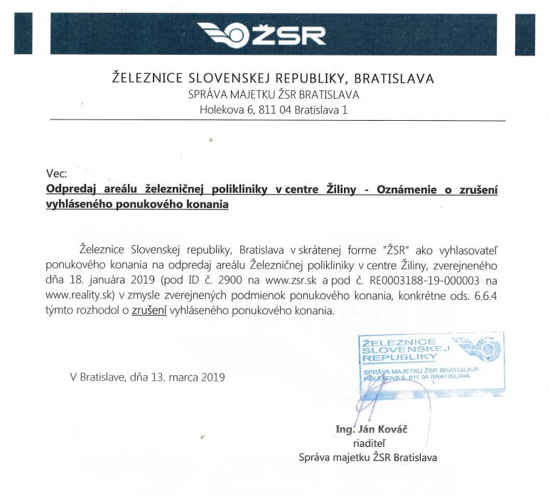Z predaja, ktorý ŽSR odôvodňovala racionalizáciou spravovaného majetku, nakoniec nebude nič. Spoločnosť ponukové konanie zrušila, rovnako tak aj na polikliniku vo Zvolene. K zrušeniu vydal riaditeľ Správy majetku ŽSR Ján Kováč dňa 13. marca oznámenie.
