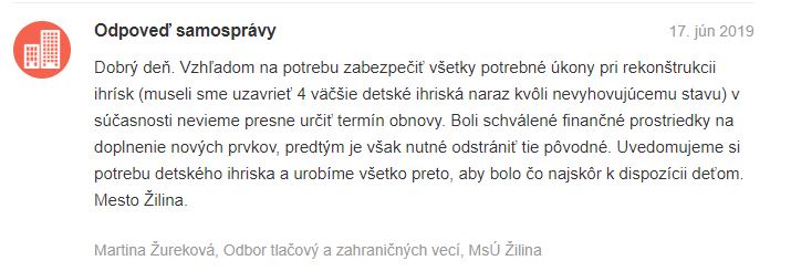 „Vzhľadom na potrebu zabezpečiť všetky potrebné úkony pri rekonštrukcii ihrísk (museli sme uzavrieť 4 väčšie detské ihriská naraz kvôli nevyhovujúcemu stavu) v súčasnosti nevieme presne určiť termín obnovy. Boli schválené finančné prostriedky na doplnenie nových prvkov, predtým je však nutné odstrániť tie pôvodné. Uvedomujeme si potrebu detského ihriska a urobíme všetko preto, aby bolo čo najskôr k dispozícii deťom“