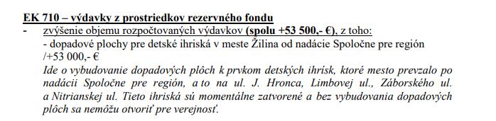 „Ide o vybudovanie dopadových plôch k prvkov detských ihrísk, ktoré mesto prevzalo po nadácii Spoločne pre región, a to na ul. J. Hronca, Limbovej ul., Záborského ul. a Nitrianskej ul. Tieto ihriská sú momentálne zatvorené a bez vybudovania dopadových plôch sa nemôžu otvoriť pre verejnosť,“ uvádza komentár k rozpočtovej zmene.