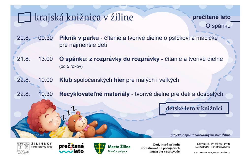 8. týždeň leta je venovaná téme spánku a čo je krajšie ako rozprávka pred spaním? Preto sme si pre našich čitateľov pripravili podujatie Z rozprávky do rozprávky. Pripravíme si rôzne tvorivé aktivity, hry a zážitkové čítanie. Tešíme sa na vás v Krajskej knižnici v Žiline v stredu 21. augusta o 13:00.