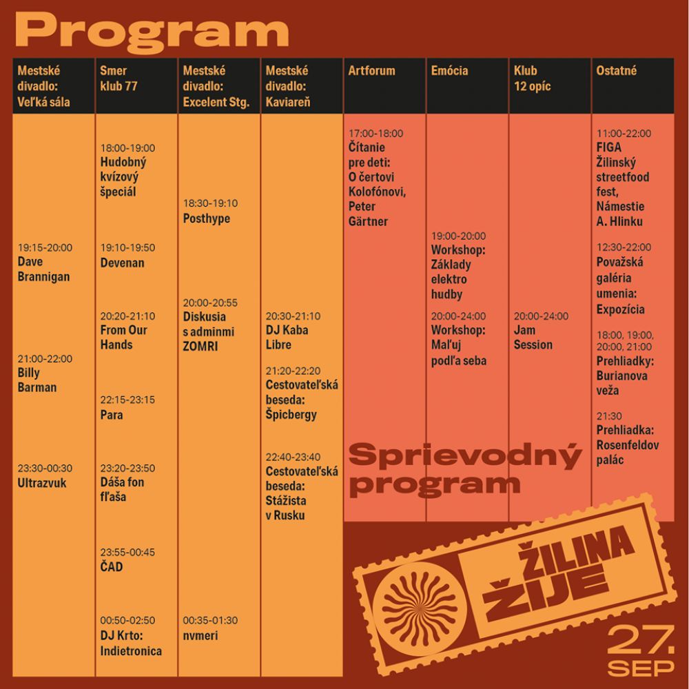 Samozrejme, niektoré koncerty a sprievodný program sa prekrývajú, aby mali diváci na výber v rovnakom čase viacero alternatív ako sa zabaviť. Všetko je prehľadne rozvrhnuté v programe a mapke na našom webe a Facebooku.