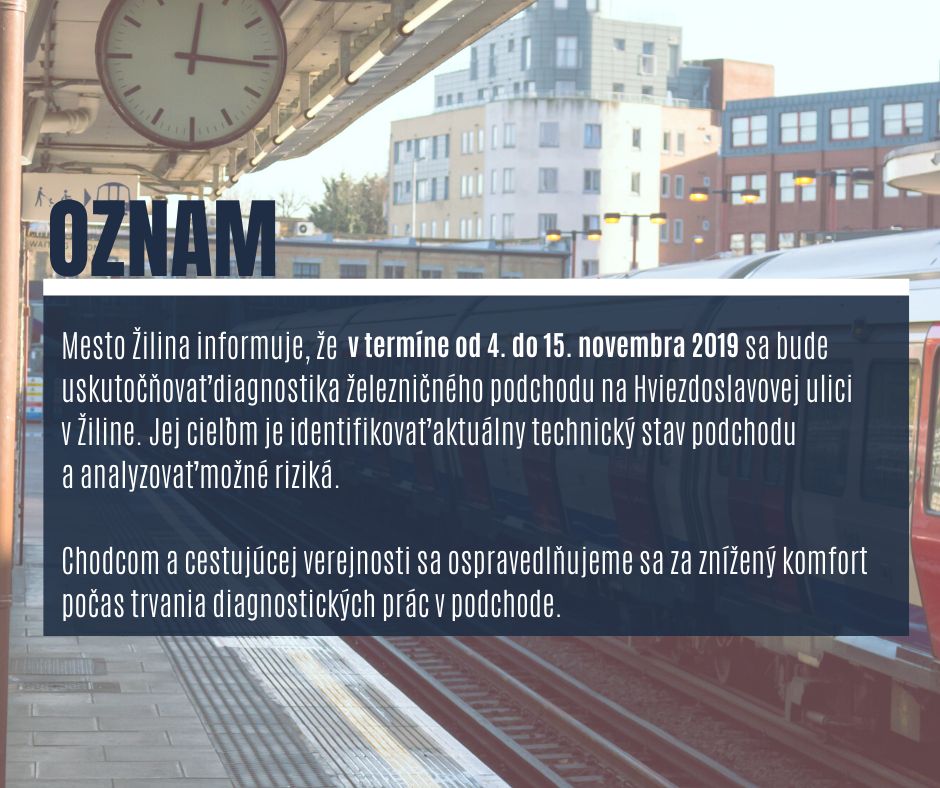 „Do 15. novembra 2019 sa bude uskutočňovať diagnostika železničného podchodu na Hviezdoslavovej ulici v Žiline. Jej cieľom je identifikovať aktuálny technický stav podchodu a analyzovať možné riziká. Počas prác budú zóny, ktoré sa budú diagnostikovať, ohradené a oddelené, aby nedošlo k zraneniu chodcov. Odvrty na vozovke a merania georadarom budú realizované v čase minimálnej dopravy, cez víkendy a v noci,“ informoval hovorca mesta Žilina Vladimír Miškovčík.