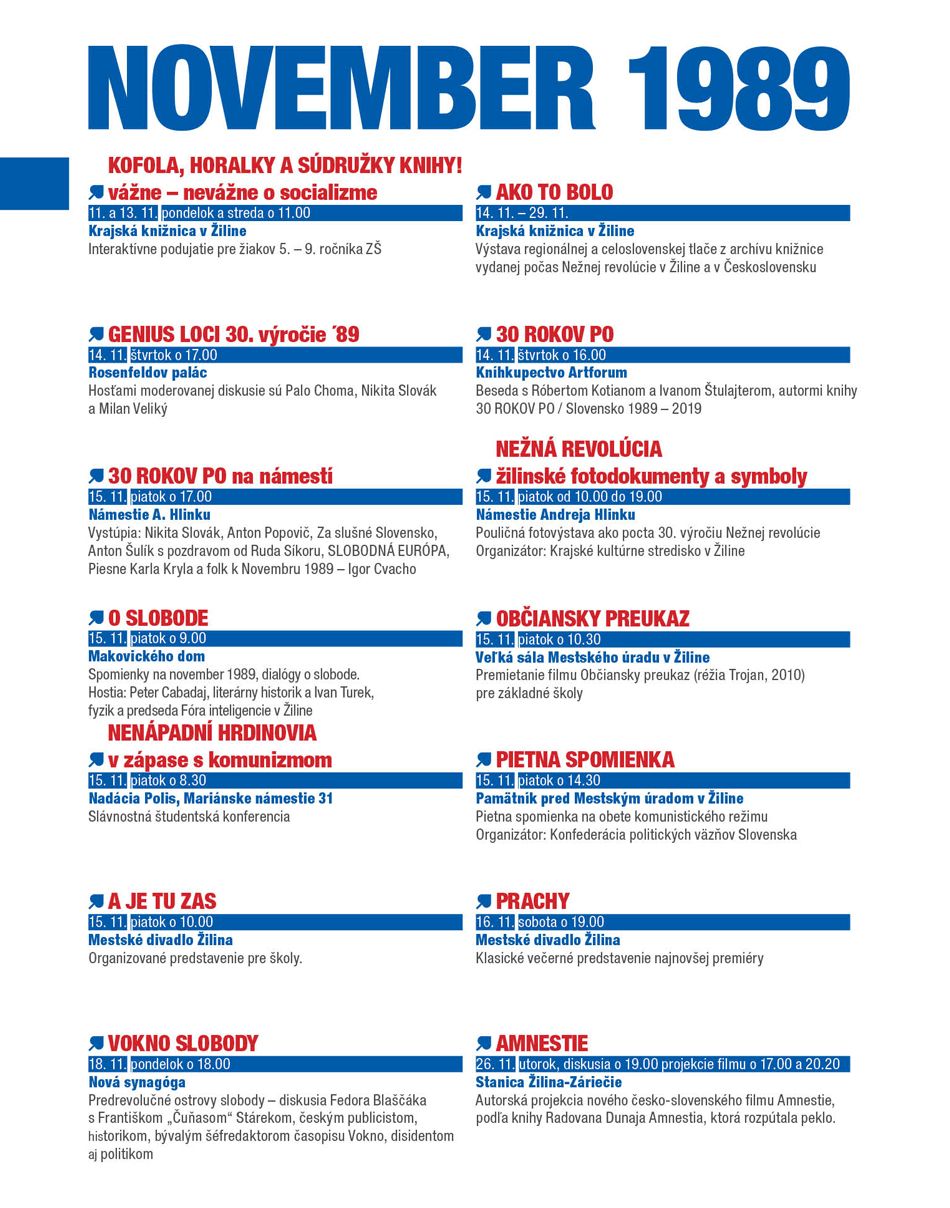 Podobne ako v novembri 1989 sa budú môcť Žilinčania dňa 15. novembra o 17.00 hodine na podujatí s názvom 30 rokov po započúvať do piesní Karla Kryla, folkových skladieb v podaní Igora Cvacha či tvorby kapely Slobodná Európa. Na Námestí Andreja Hlinku vystúpia okrem nich aj umelci Nikita Slovák, Anton Popovič či Anton Šulík s pozdravom od Ruda Síkoru.
