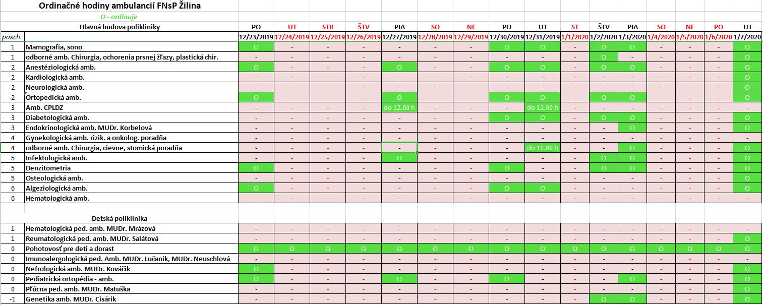 Ambulancie Fakultnej nemocnice s poliklinikou v Žiline nachádzajúce sa v hlavnej budove polikliniky a v priestoroch detskej polikliniky (mimo súkromných ambulancií) sú otvorené podľa zoznamu zverejneného na www.fnspza.sk v sekcii Aktuálne – Ordinačné hodiny ambulancií FNsP Žilina počas vianočných sviatkov.