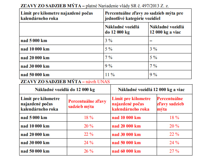 Požiadavkou dopravcov UNAS sa dnes zaoberala na svojom zasadnutí aj vláda, vzala na vedomie materiál, ktorý spresňuje, že v prípade prijatia požiadaviek na percentuálne výšky zliav by došlo k porušeniu európskej smernice z roku 1999. Podľa nej môže štát zľavniť dopravcom len 13% z poplatku za infraštruktúru oproti vozidlám, ktoré na zľavu nemajú nárok.