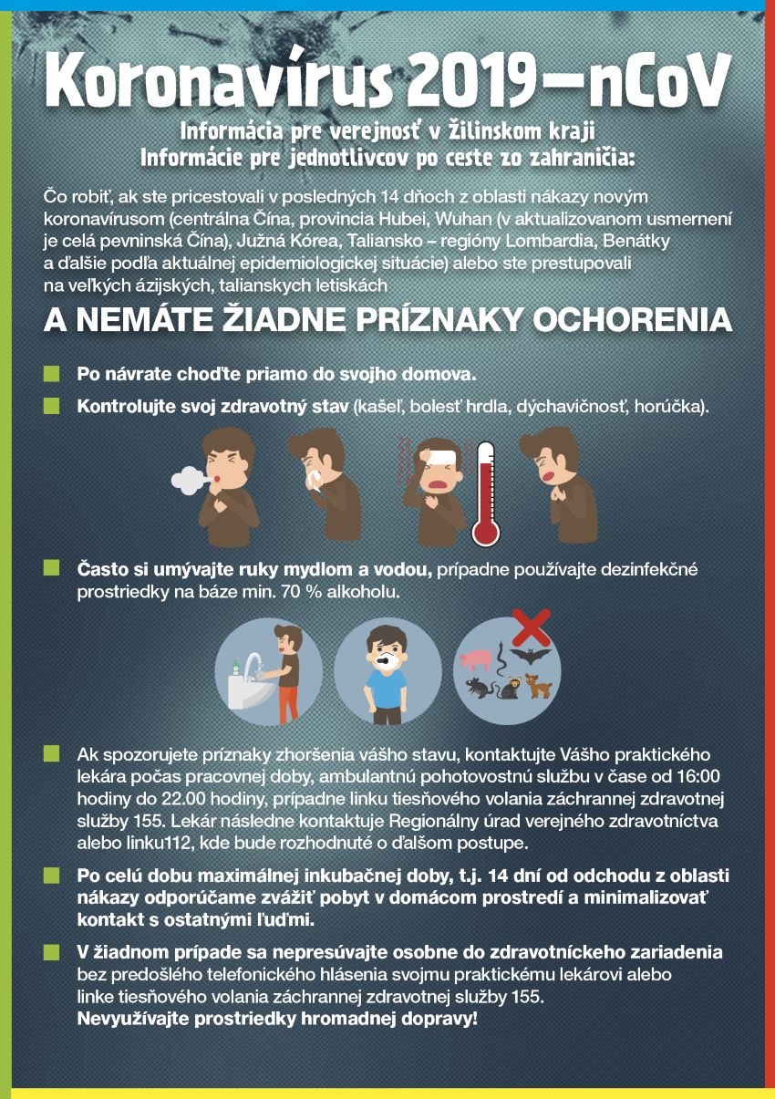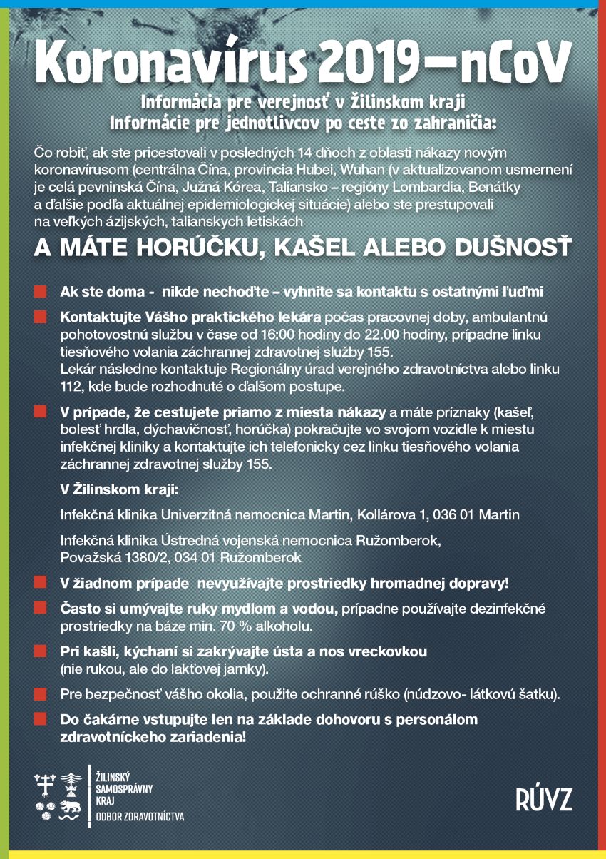 „V prvom rade sme považovali za nutné informovať verejnosť, na ktorú sa zo všetkých strán hrnú rôzne informácie, často však i nepotvrdené poplašné správy. Dôležité je byť pripravený, nie šíriť zbytočnú paniku. Pripravili sme preto pre verejnosť informačné materiály, ktoré sa týkajú predovšetkým preventívnych opatrení, prejavov samotnej nákazy aj čo robiť po návrate z krajín, kde sa vírus rozšíril,“ uviedla riaditeľka odboru zdravotníctva ŽSK Silvia Pekarčíková.