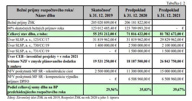 Žilinský samosprávny kraj si už v októbri požičal 6 508 960 eur od Ministerstva financií Slovenskej republiky. Tie majú pomôcť vykompenzovať výpadky dane z príjmov fyzických osôb v roku 2020 v dôsledku pandémie ochorenia COVID-19. Ďalších 15 miliónov eur si požičal kraj minulý rok na rekonštrukciu mostných objektov a ciest II. a III. triedy, ku koncu októbra mu rezort financií vyplatil 11,3 miliónov z tejto sumy. Dlh samosprávy by mal budúci rok dosiahnuť takmer dve pätiny bežných príjmov.