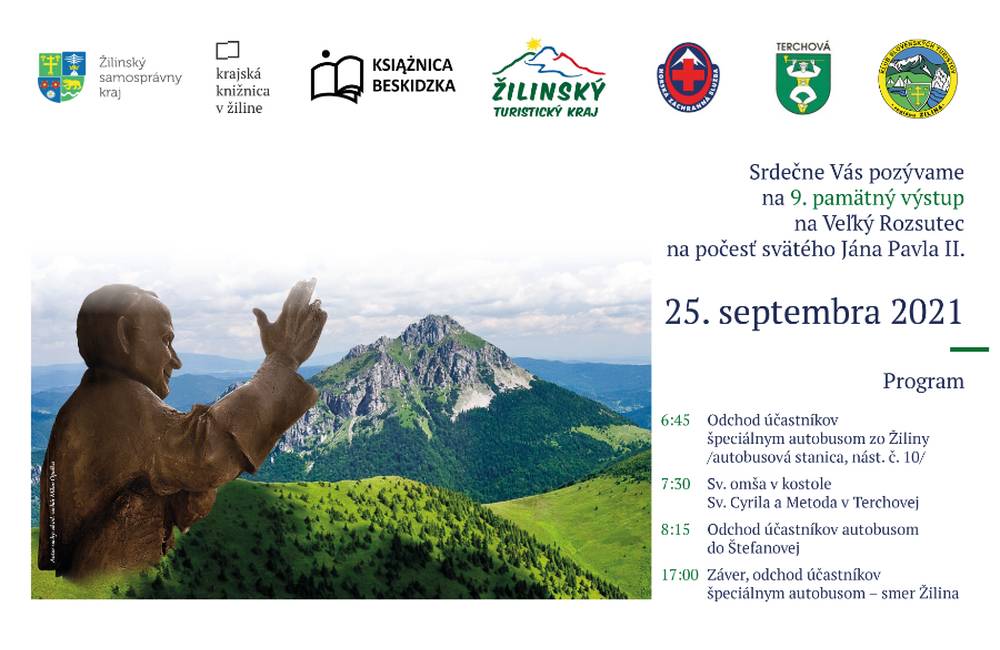 Žilinský samosprávny kraj, Krajská knižnica v Žiline, ktorá pôsobí v jeho zriaďovateľskej pôsobnosti, Obec Terchová, Horská záchranná služba Malá Fatra, Krajská organizácia cestovného ruchu Žilinský turistický kraj, Klub slovenských turistov Žilina a Ksiaznica Beskidzka Vás srdečne pozývajú na 9. pamätný výstup na Veľký Rozsutec, ktorý sa uskutoční 25. septembra 2021 na počesť sv. Jána Pavla II., jednej z najznámejších osobností našich novodobých dejín.
