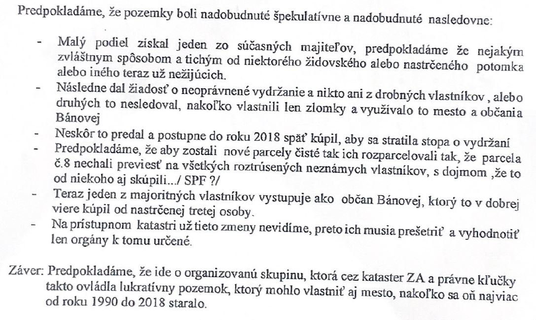 Samotný prípad v Bánovej rozoberieme vďaka podrobne spracovanej analýze v osobitnom článku, zároveň sme oslovili mesto aj poslankyňu so žiadosťou o doplňujúce informácie nielen v tomto prípade. Okrem poslancov a médií sa prípadom zaoberá aj vyšetrovateľ, keďže občania Bánovej podali vo veci trestné oznámenie k rukám generálneho prokurátora Maroša Žilinku. V kópii žiadajú o pomoc aj Židovskú náboženskú obec Žilina, keďže parcely patrili bývalým židovským rodinám.