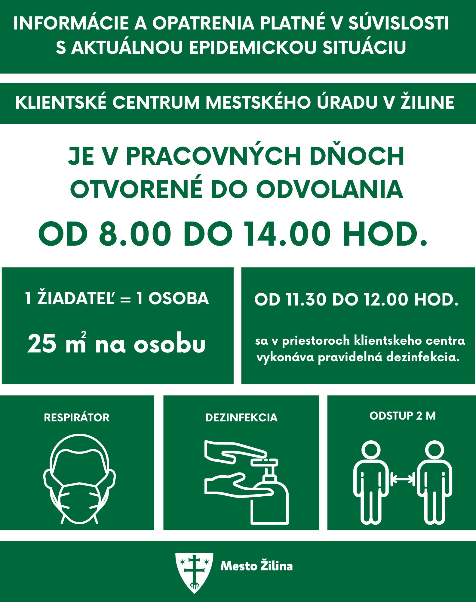 „Otváracie hodiny sú od pondelka do piatka od 8.00 do 14.00 hod. V čase od 11.30 do 12.00 hod. sa v priestoroch klientskeho centra vykonáva pravidelná dezinfekcia, vtedy nie sú služby pre verejnosť k dispozícii,“ doplnil hovorca mesta Žilina Vladimír Miškovčík s tým, že mesto žiada klientov, aby mali prekryté dýchacie cesty respirátorom a dodržiavali rozostupy.