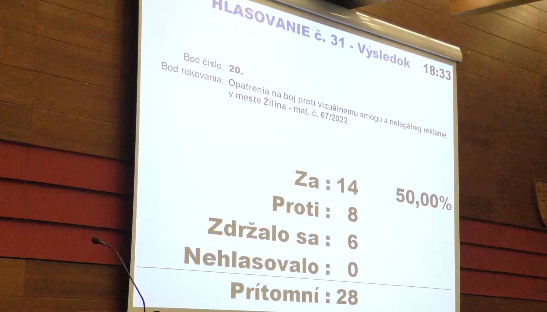 Všetko nasvedčovalo tomu, že návrh prejde, keďže skupina 14 poslancov uspela s pokusom o obmedzenie „vizuálneho smogu“ v meste, a to zakázaním poskytovania mestského majetku na reklamu. Počas prvého hlasovania poslanec Delinčák vyjadril v zmysle zákona svoj konflikt záujmov a do hlasovania sa nezapojil.