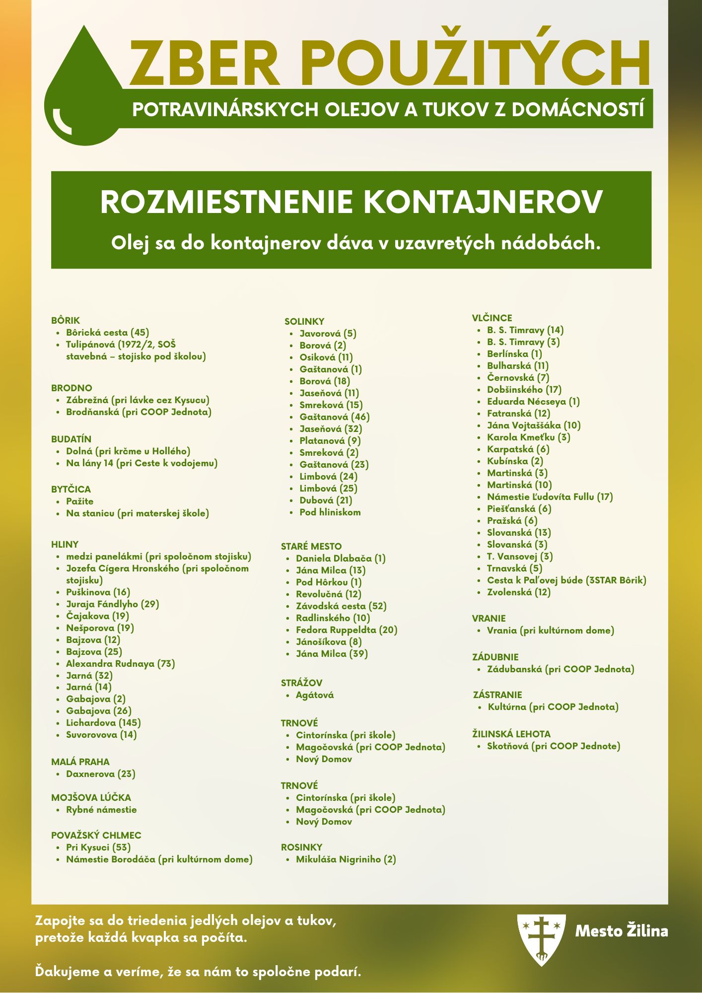 Kompletný a presný zoznam nových stojísk kontajnerov je zverejnený na obrázku nižšie. A viac informácii o triedení oleja na stránke TriedimOlej.sk.
