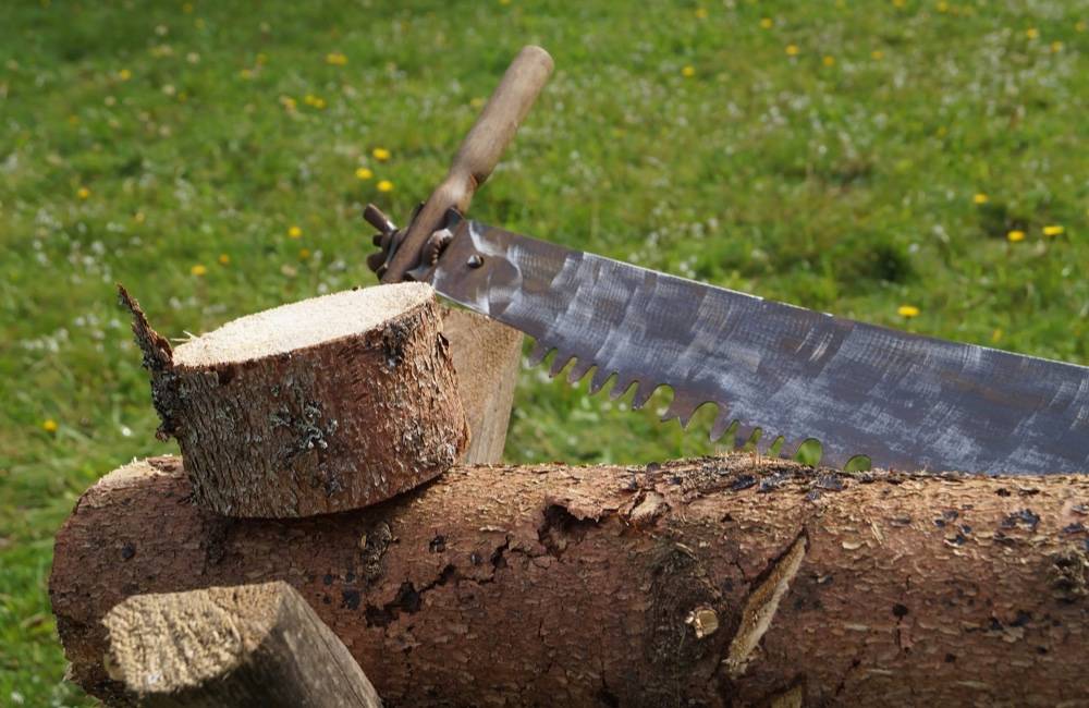 Lúpanie kôry z dreva a pílenie dreva ručnou pílou