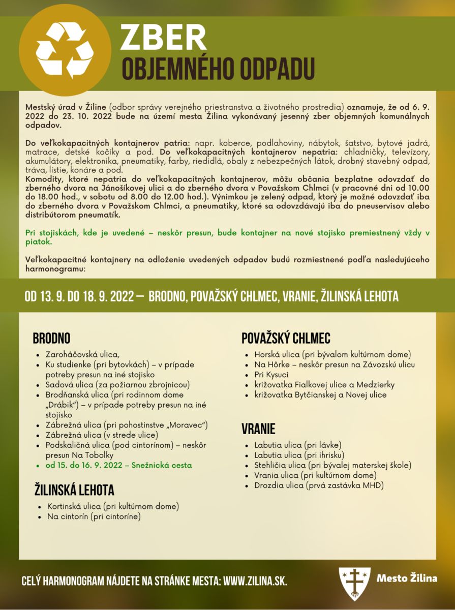 Od utorka 13. septembra do nedele 18. septembra sa môžu obyvatelia mestských častí Brodno, Považský Chlmec, Vranie a Žilinská Lehota zbaviť objemného komunálneho odpadu. Veľkokapacitné kontajnery sú na území mesta umiestňované počas jesenného zberu odpadu od 6. septembra do 23. októbra 2022.