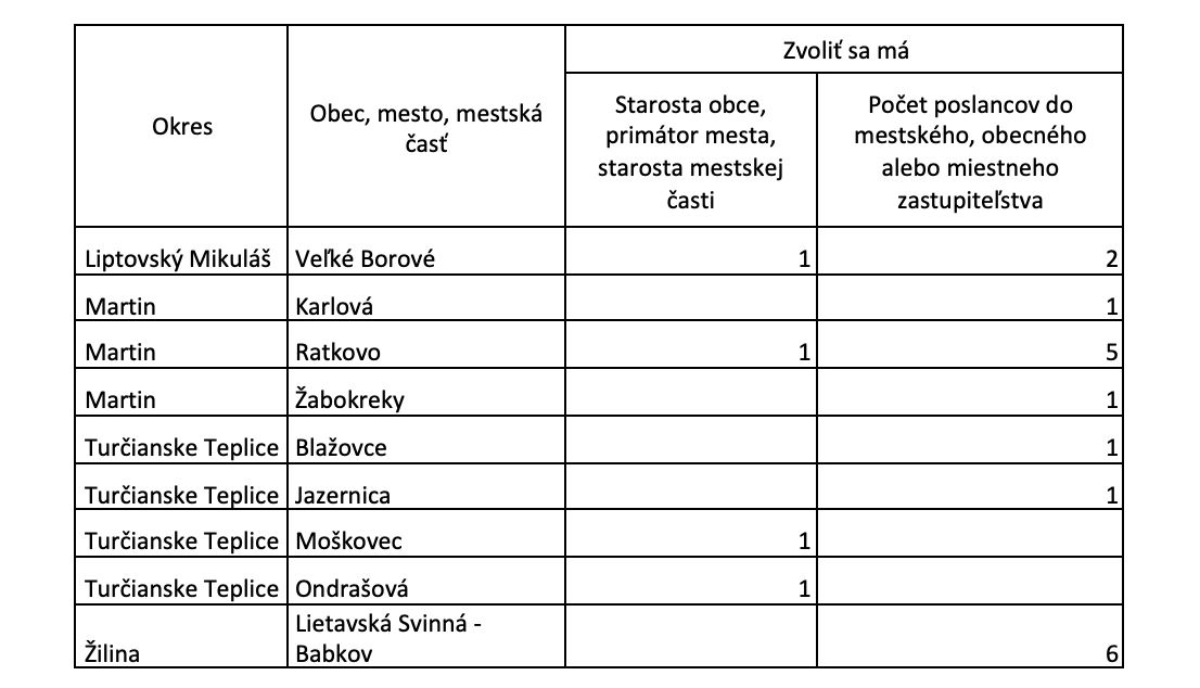 Predseda Národnej rady Slovenskej republiky by preto mal do 30 od vyhlásenia výsledkov volieb vyhlásiť nové voľby, a to najneskôr 110 dní predo dňom ich konania. Zoznam obcí Žilinského kraja, v ktorých budú vyhlásené nové komunálne nájdete v nasledujúcej tabuľke: