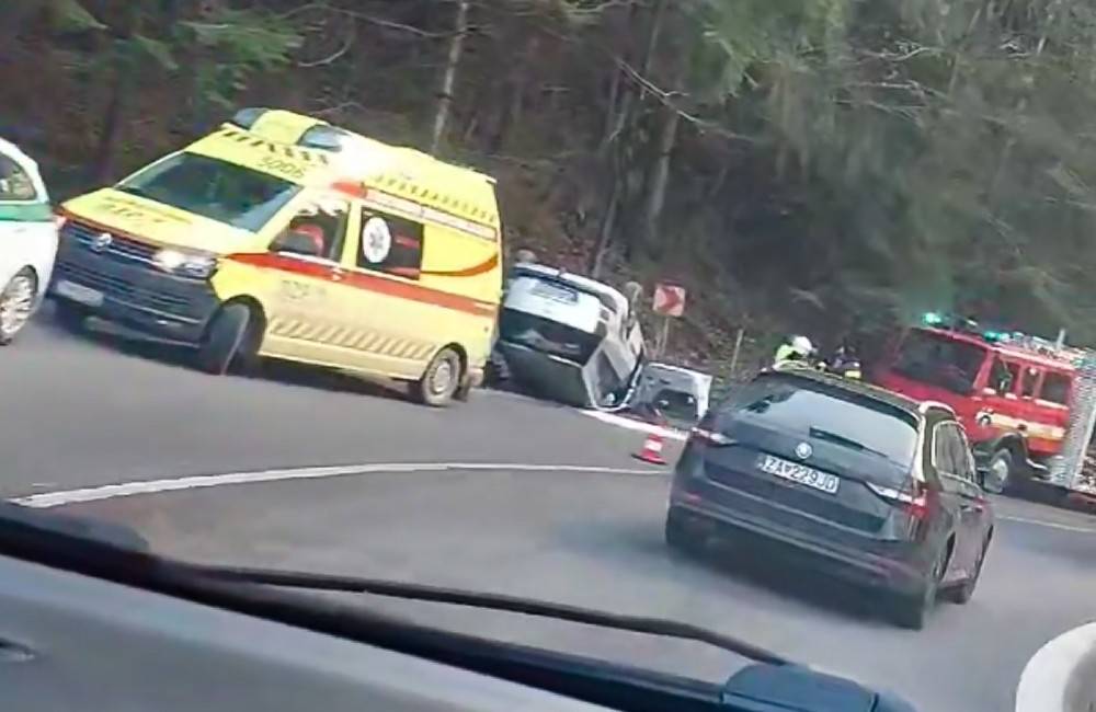 VIDEO: Na hlavnom ťahu na Makov došlo k ďalšej nehode, auto skončilo prevrátené na streche vedľa cesty