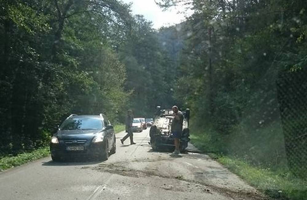 Práve sa deje: Na ceste do Lietavy skončilo auto prevrátené na streche
