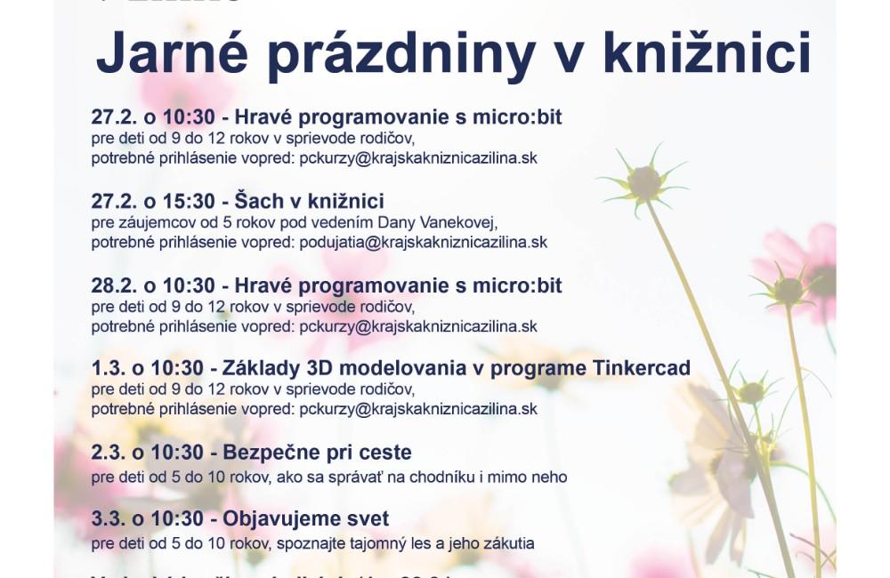 Od pondelka 27. februára začínajú žiakom Žilinského kraja jarné prázdniny, ktoré potrvajú do piatka 3. marca. Krajská knižnica v Žiline si pri tejto príležitosti pripravila pestrú ponuku podujatí pre tých, ktorí aj počas voľných dní túžia po poznaní a nových vedomostiach: