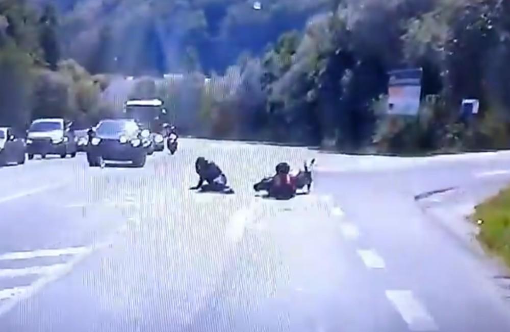 Osoba po náraze spadla z motorky priamo pred protiidúce vozidlo, ktoré, našťastie, stihlo zabrzdiť. Motorkár sa po chvíli zo zeme postavil a odkríval na okraj cesty, kde sa pristavil ďalší vodič motocykla. Pozrite si zábery z kamery v automobile svedka udalosti.