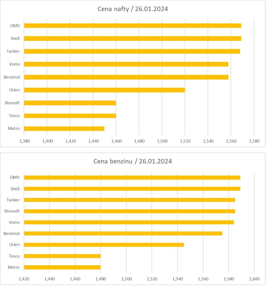 Liter pohonných hmôt sa na konci roka 2023 predával na čerpacích staniciach za priemernú cenu 1,51 eur pri nafte a 1,54 eur pri benzíne. Na konci januára platíme za diesel 1,54 eur a benzín 1,56 eur.