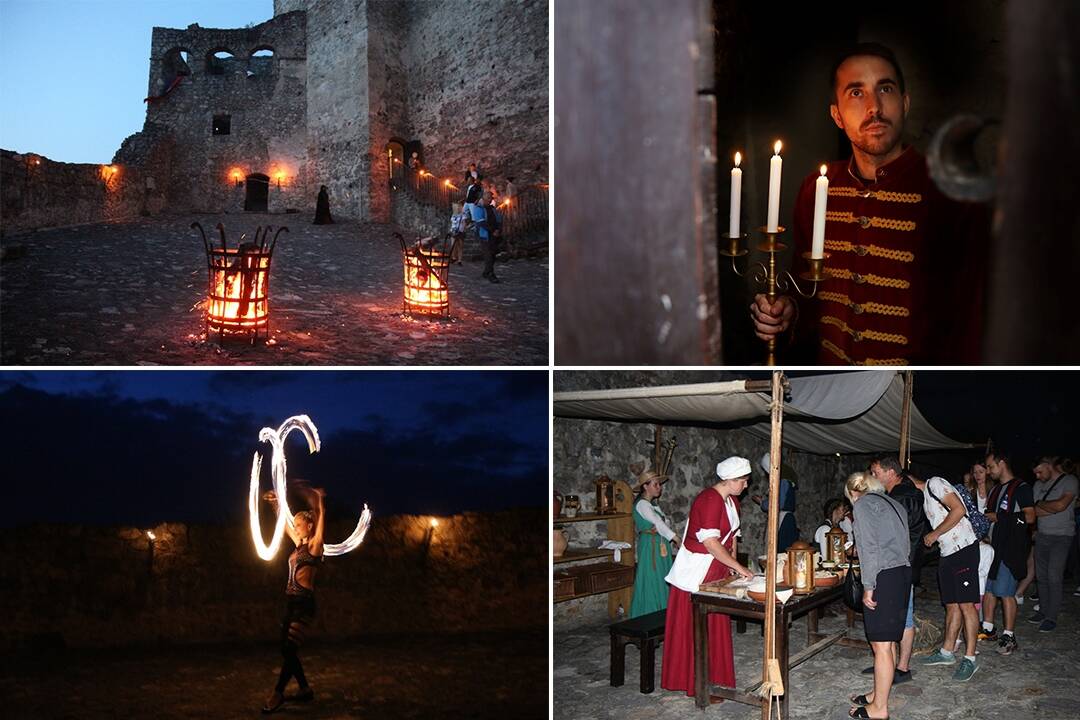 Po prehliadke hradu si návštevníci môžu užiť skvelú ohňovú show, ktorú pripraví Magic Flames a pochutiť si na dobových špecialitách z kuchyne Cech Terra de Selinan. Prehliadky budú prebiehať v ôsmich vstupoch od 20:30 do 00:00 a návštevníkom odporúčame vziať si baterky.
