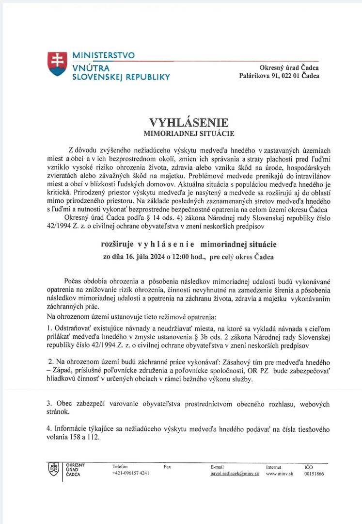 Okresný úrad v Čadci vyhlásil 16. októbra 2024 vo všetkých obciach okresu mimoriadnu situáciu kvôli nežiaducemu výskytu medveďa hnedého v zastavaných územiach a ich bezprostrednom okolí. Vyhlásená mala byť aj na základe podnetov od obyvateľov, informuje mesto Čadca.