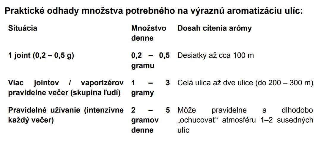 Odpoveď je pomerne jednoduchá. Pravdepodobne ide o osoby, ktoré vaporizujú alebo spaľujú rôzne časti konopy siatej pre vlastnú potrebu. Na výraznú arómu šíriacu sa ulicami stačí veľmi malé množstvo, podľa Mateja len 0,1 až 0,3 gramu spaľovanej sušiny (typický joint). Takýto dym dokáže „ochutiť“ vzduch v okruhu desiatok až niekoľkých stoviek metrov, najmä pri bezvetrí. Pri vaporizácii je intenzita vône nižšia, 0,3 až 0,5 gramu môže byť cítiť v okruhu 20 až 50 metrov.