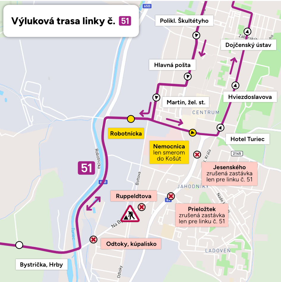 Uzávierka ovplyvní aj premávku mestskej hromadnej dopravy. Dopravný podnik mesta Martin oznamuje zmenu trasy linky číslo 51, ktorá bude počas uzávierky premávať po obchádzkovej trase.