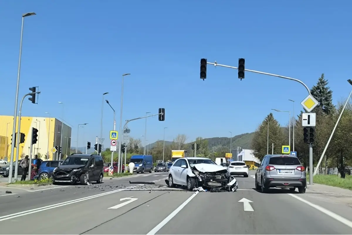 Pri predajni Sconto sa zrazili osobné autá. Na ceste ležia kusy karosérie, spomaľte