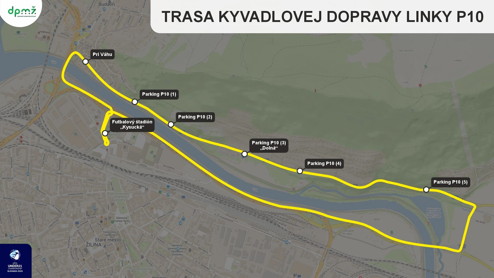 Spoje kyvadlovej dopravy budú vypravované zo zastávky „Kysucká“ (futbalový štadión), vedené cez zastávku „Pri Váhu“ a následne budú obsluhovať päť zastávok na Dolnej ulici v rámci záchytného parkoviska. Dopravca zároveň upozorňuje, že z dôvodu zjednosmernenia Dolnej ulice nebudú v dňoch zápasov po 10. hodine. vykonávané spoje linky č. 29 v úseku zastávok „Železničná stanica“ a „Dolná“. Za zrušené spoje linky č. 29 bude ponúknutá náhrada vo forme garantovaných spojov kyvadlovej dopravy linky P10.