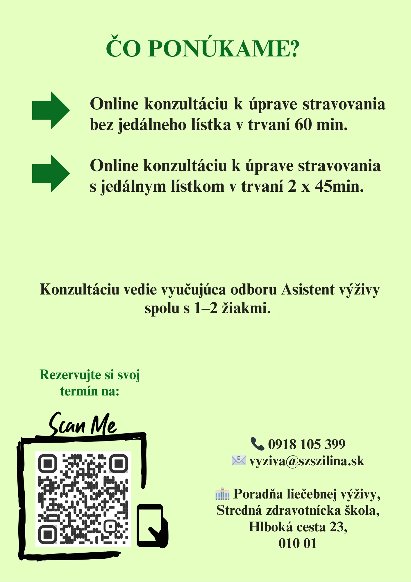 Škola v rámci projektu zakúpila nutričný softvér, vytvorila systém objednávania konzultácií a zriadila technicky vybavený priestor pre online poradenstvo. Výsledkom je nielen vyššia kvalita praktickej prípravy žiakov, ale aj rozvoj ich digitálnych zručností, ktoré sú dnes nevyhnutné.