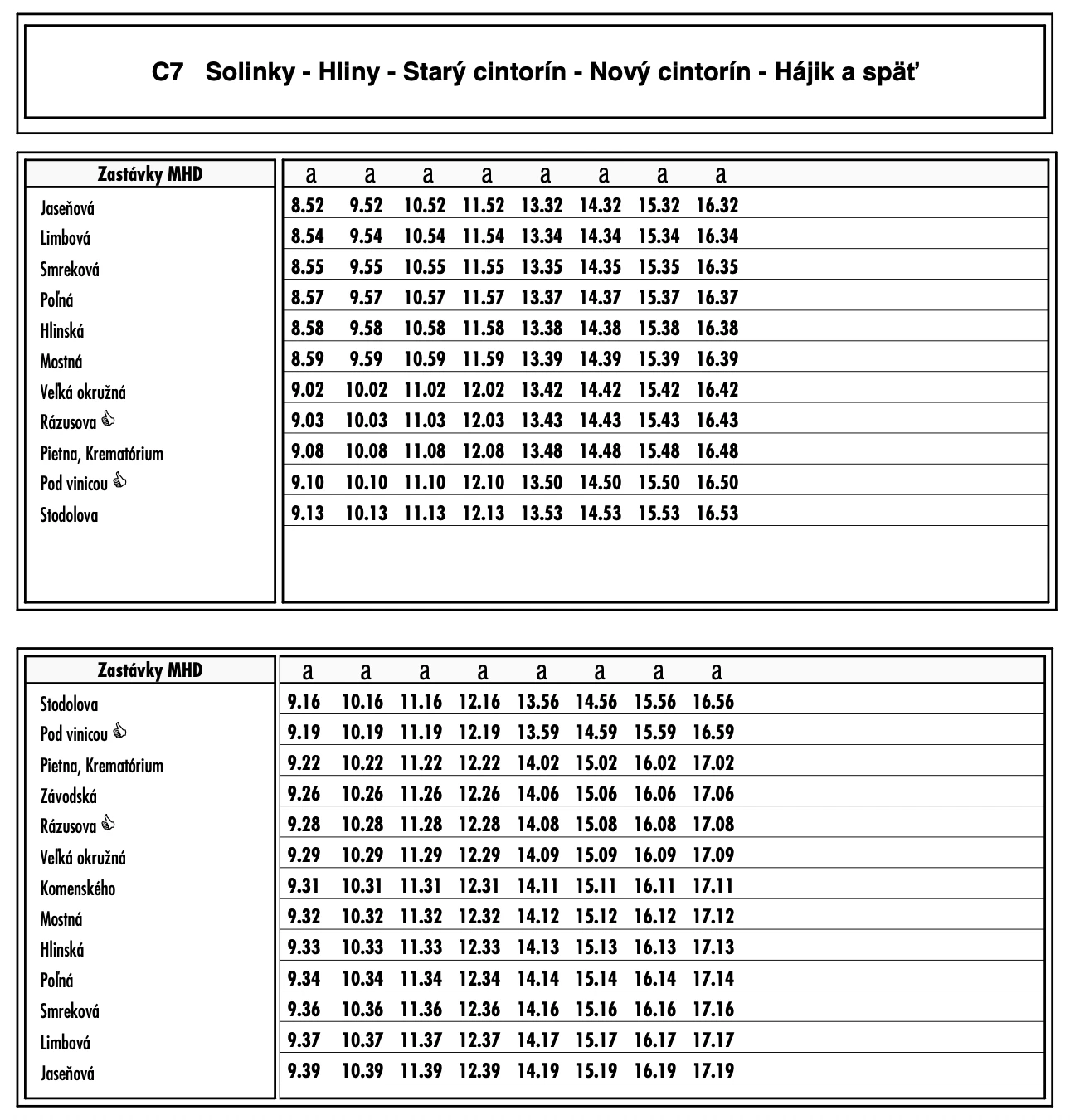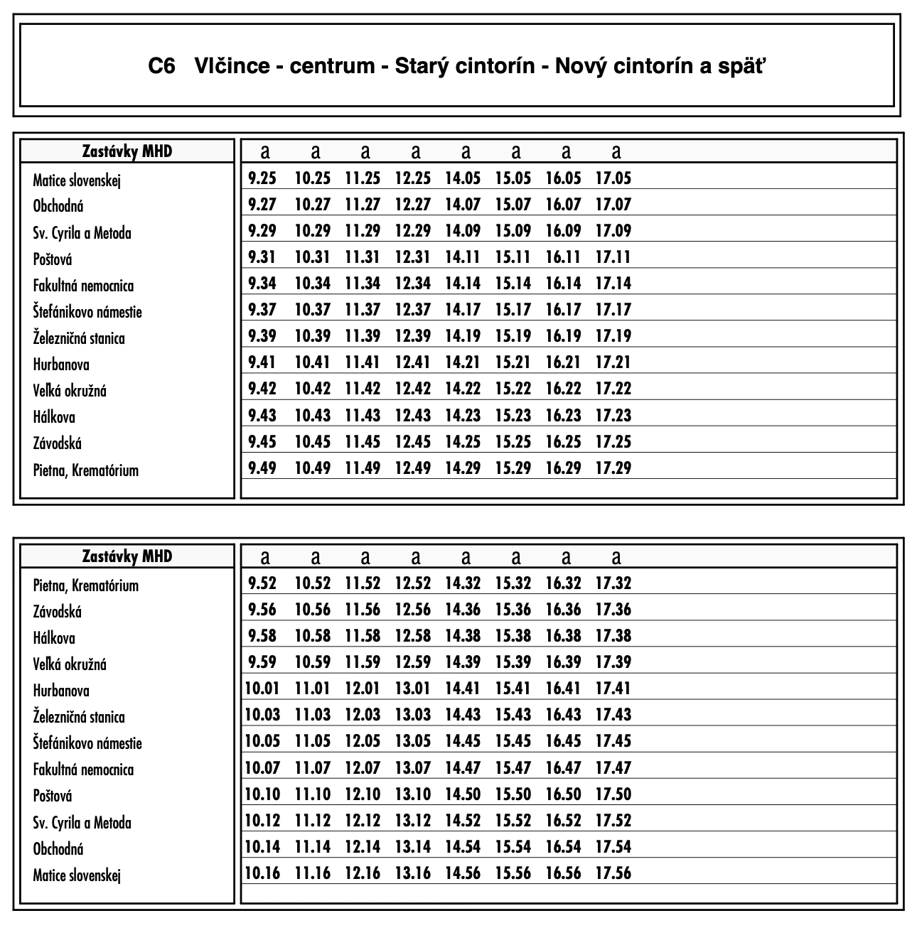 V dňoch od 30. októbra do 31. októbra bude platiť prázdninový režim. Cez sviatočné dni bude zabezpečená preprava cestujúcich mimoriadnymi linkami C6 a C7 medzi sídliskami Vlčince, Solinky, Hliny, Hájik a Starým a Novým cintorínom.