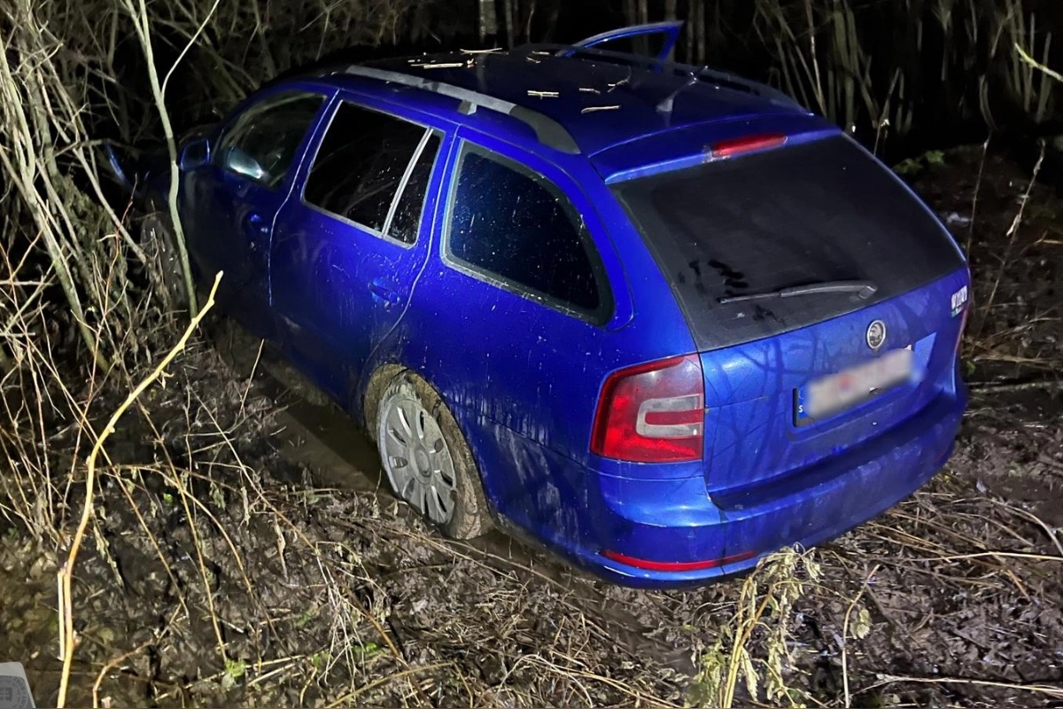 Policajti sa za vozidlom vydali po miestnych komunikáciách. Za mestskou časťou Dovalovo vodič v prudkej pravotočivej zákrute nezvládol riadenie, zišiel mimo vozovku a auto skončilo v poli, kde ho zastavili až kríky. Vodič aj spolujazdci sa po zastavení dali na útek.
