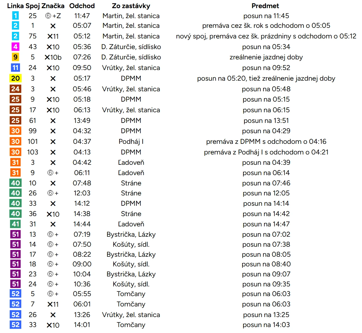 Konkrétne ide o linky s číslami 1, 2, 4, 9, 11, 20, 24, 25, 30, 31, 40, 41, 51 a 52. Na väčšine z nich dôjde k úpravám viacerých spojov počas dňa, preto sa oplatí preveriť si konkrétny čas odchodu ešte pred cestou.