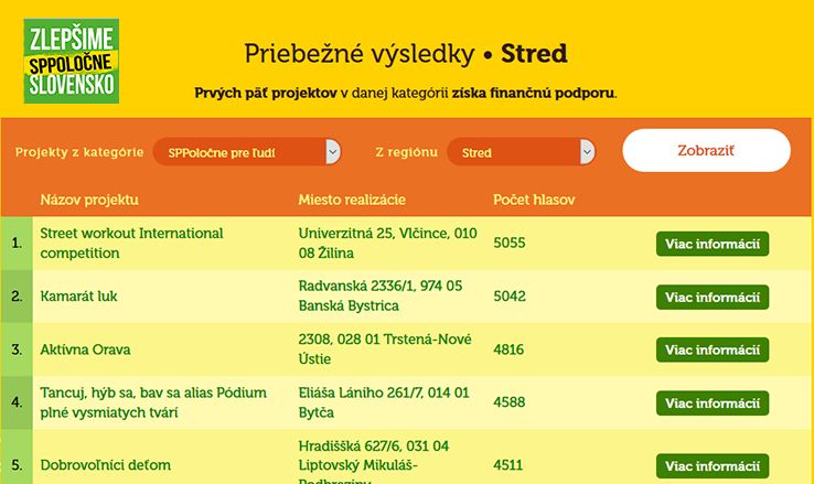 Požadovaná výška podpory v rámci projektu Zlepšime sppoločne Slovensko bola 6 000 eur. Oficiálne výsledky budú zverejnené 7. októbra 2016.