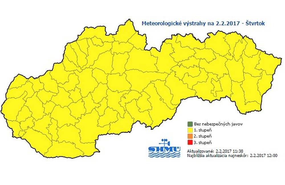 Výstraha 1.stupňa pred hmlou platí do 3.2.2017 - 10:00 hod. Lokálne sa očakáva výskyt hmiel s dohľadnosťou 50 - 200 m. Znížená dohľadnosť predstavuje potenciálne nebezpečenstvo pre dopravné aktivity. Výskyt hmiel s uvedenou dohľadnosťou je v danej ročnej dobe a oblasti bežný, ale môže spôsobiť škody menšieho rozsahu.