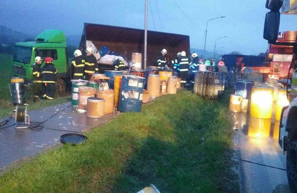 Pri Bytči sa ráno prevrátilo nákladné vozidlo prevážajúce nebezpečné látky
