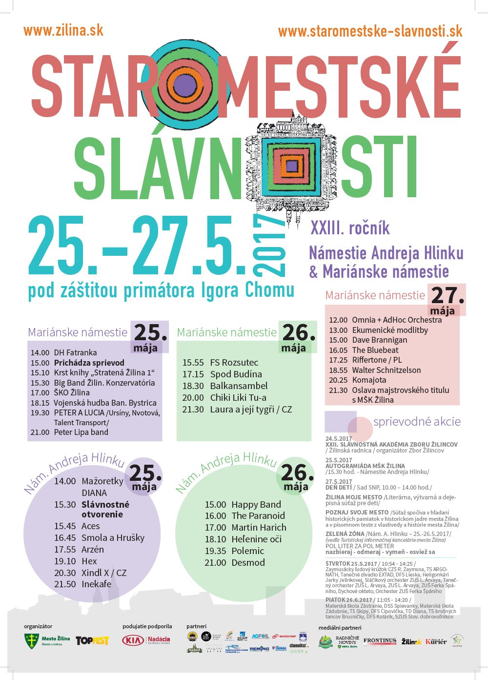 Už od štvrtka 25. mája do do soboty 27. mája 2017 sa na pódiách na Mariánskom a Hlinkovom námestí v Žiline predstaví množstvo umelcov, ktorí predvedú rôzne hudobné žánre. Kultúrne podujatie, ktoré sa koná pod záštitou primátora Žiliny Igora Chomu, prinesie aj tento rok do ulíc mesta množstvo zábavy, hudby, remesiel i viaceré sprievodné podujatia.