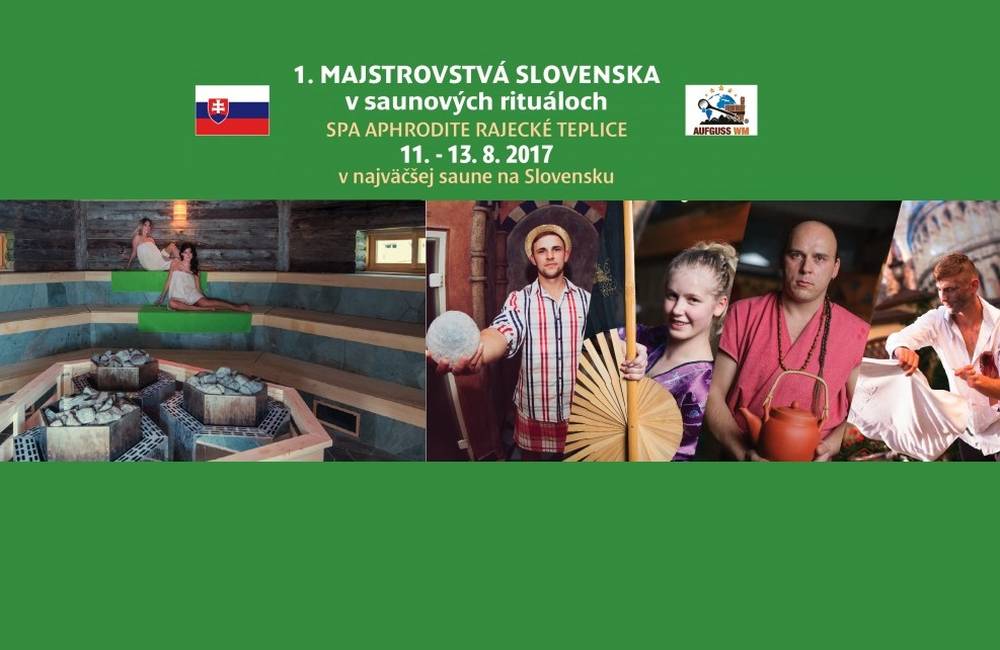 Spa Aphrodite Rajecké Teplice pozývajú na historicky 1. majstrovstvá Slovenska v saunových rituáloch, ktoré sa uskutočnia v dňoch 11.8. - 13.8. 2017 v Rajeckých Tepliciach. Saunový rituál predstavuje zážitkové saunovanie, ktoré trvá 10-13 min., počas ktorého saunamajster polievaním kameňov zvyšuje teplotu a relatívnu vlhkosť vzduchu v saune, používa prírodné silice a pomôcky na ovievanie návštevníkov.