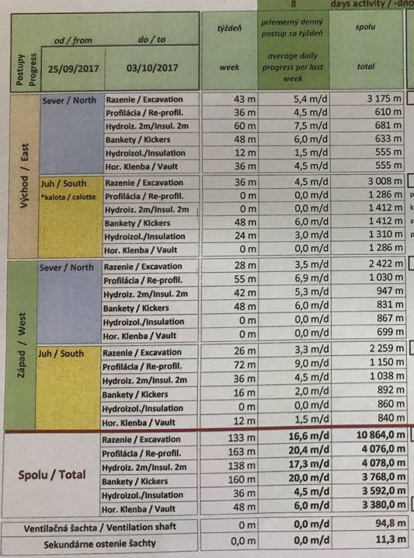 V tuneli Višňové sa razí priemernou rýchlosťou takmer 17 metrov za deň. Ide o celkový počet vyrazených metrov v oboch tunelových rúrach - na štyroch čelbách. Z celkových 15 000 metrov je ku dňu 6.10.2017 vyrazených viac ako 10 800 metrov. Vyplýva to zo zverejnenej tabuľky.