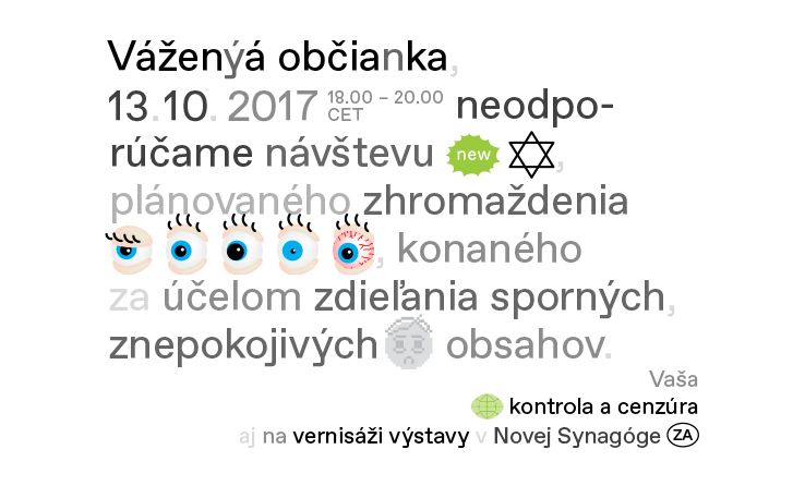 Výstava Globálna kontrola a cenzúra, ktorú aktuálne inštalujeme v Synagóge, skúma nezastaviteľný prienik kontroly a cenzúry do nášho každodenného života. Obsahuje diela umelcov a aktivistov z dvadsiatich krajín a prvýkrát bola uvedená v Centre pre umenie a médiá ZKM Karslruhe. Na Slovensko ju prinášame spolu s Goethe-Institut Bratislava a pozývame vás na jej otvorenie v piatok 13. 10. 2017 o 18.00.