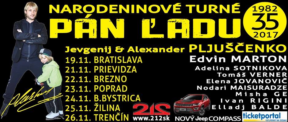 Dnes sa píše rok 2017 a čaká nás opäť krasokorčuliarky sviatok na najvyššej úrovni. NARODENINOVÉ TURNÉ PÁN ĽADU JEVGENIJ PLJUŠČENKO zavíta do siedmich slovenských miest, z toho do piatich po prvýkrát. Je pripravený spolu s víťazkou zimných OH Adelinou Sotnikovou, Tomášom Vernerom, Elenou Jovanovič, Nodarom Maisuradzem, Mischom Ge, Ivanom Riginim, Elladjom Baldem........ Títo všetci sa predstavia v Bratislave, Prievidzi, Brezne, Poprade, B.Bystrici, Žiline a Trenčíne.