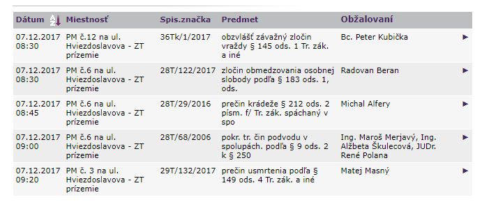 Prehľad trestných pojednávaní zo stránky justice.gov.sk