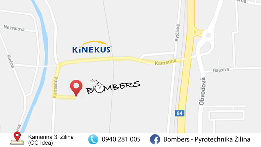 Žilinský obchod s pyrotechnikou - Bombers, ktorý sa nachádza v OC Idea na Kamennej ulici 3, vám pomôže vybrať to pravé. Či už máte radšej svetelné alebo zvukové efekty, skúsený personál vám uľahčí výber toho pravého od prskaviek pre najmenších až po grandiózne ohňostroje. Výhodou je okrem nízkej ceny aj to, že pri výbere ohňostrojov vám priamo na predajni ukážu na monitore to, ako v skutočnosti vyzerajú.