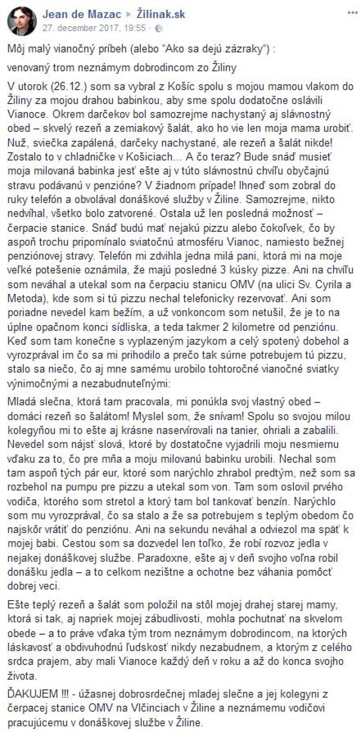 Nakoniec teda všetko dobre dopadlo a trojica sa mohla spokojne slávnostne navečeriať. „Ešte teplý rezeň a šalát som položil na stôl mojej drahej starej mamy, ktorá si tak, aj napriek mojej zábudlivosti, mohla pochutnať na skvelom obede – a to práve vďaka tým trom neznámym dobrodincom, na ktorých láskavosť a obdivuhodnú ľudskosť nikdy nezabudnem, a ktorým z celého srdca prajem, aby mali Vianoce každý deň v roku a až do konca svojho života,“ uzatvára čitateľ, ktorý ďakuje dobrosrdečnej mladej slečne a jej kolegyni z čerpacej stanice OMV na Vlčinciach v Žiline a neznámemu vodičovi pracujúcemu v donáškovej službe v Žiline.