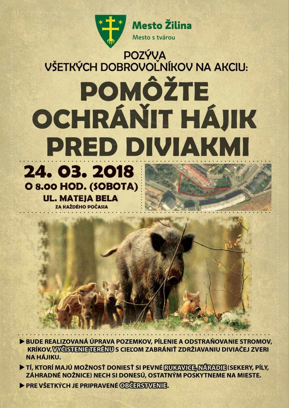 Diviaky hľadajú potravu v odpadových košoch či okolí supermarketu. „Dovoľte mi preto pozvať Vás na túto akciu, ktorá sa bude konať v sobotu 24. marca 2018 od 8.00 hod. v blízkosti ulice Mateja Bela na Hájiku aj za účasti primátora Žiliny Igora Chomu,“ uviedla hovorkyňa mesta Žilina Barbora Zigová k priloženej pozvánke vo forme plagátu.
