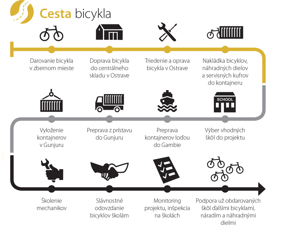 Minulý rok v novembri sa v Žiline uskutočnila prvá nakládka približne 80-tich zozbieraných bicyklov, ktoré putovali do centrálneho skladu v Ostrave. Odtiaľ sa minulý týždeň slávnostne naložili spolu s ďalšími bicyklami do kontajnera a spoločne putujú do Hamburgu, odkiaľ sa loďou presunú do africkej Gambie.