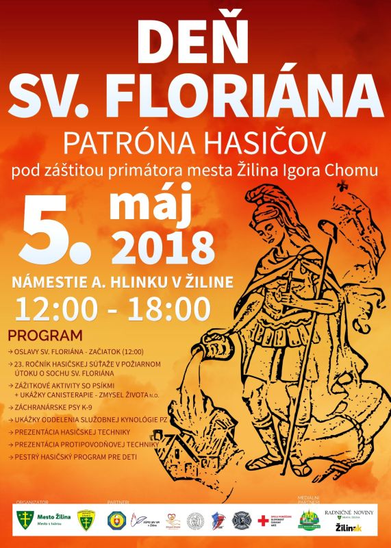 Deň svätého Floriána, patróna hasičov, oslávia tento rok v Žiline veľkolepo. Už v sobotu 5. mája budú od 12:00 hod. pripravené na námestí Andreja Hlinku oslavy, súťaže, program pre deti aj ukážky kynológov či hasičskej techniky.